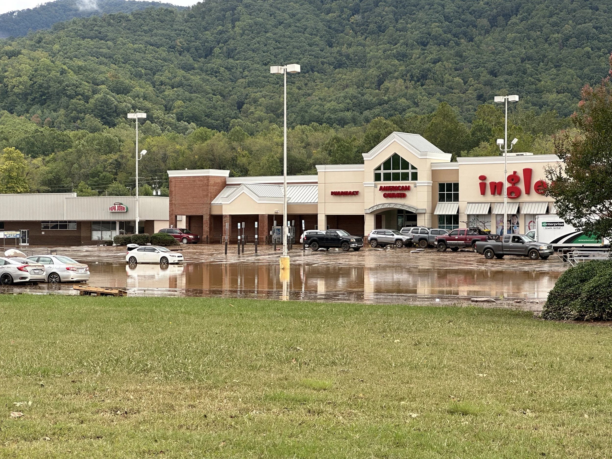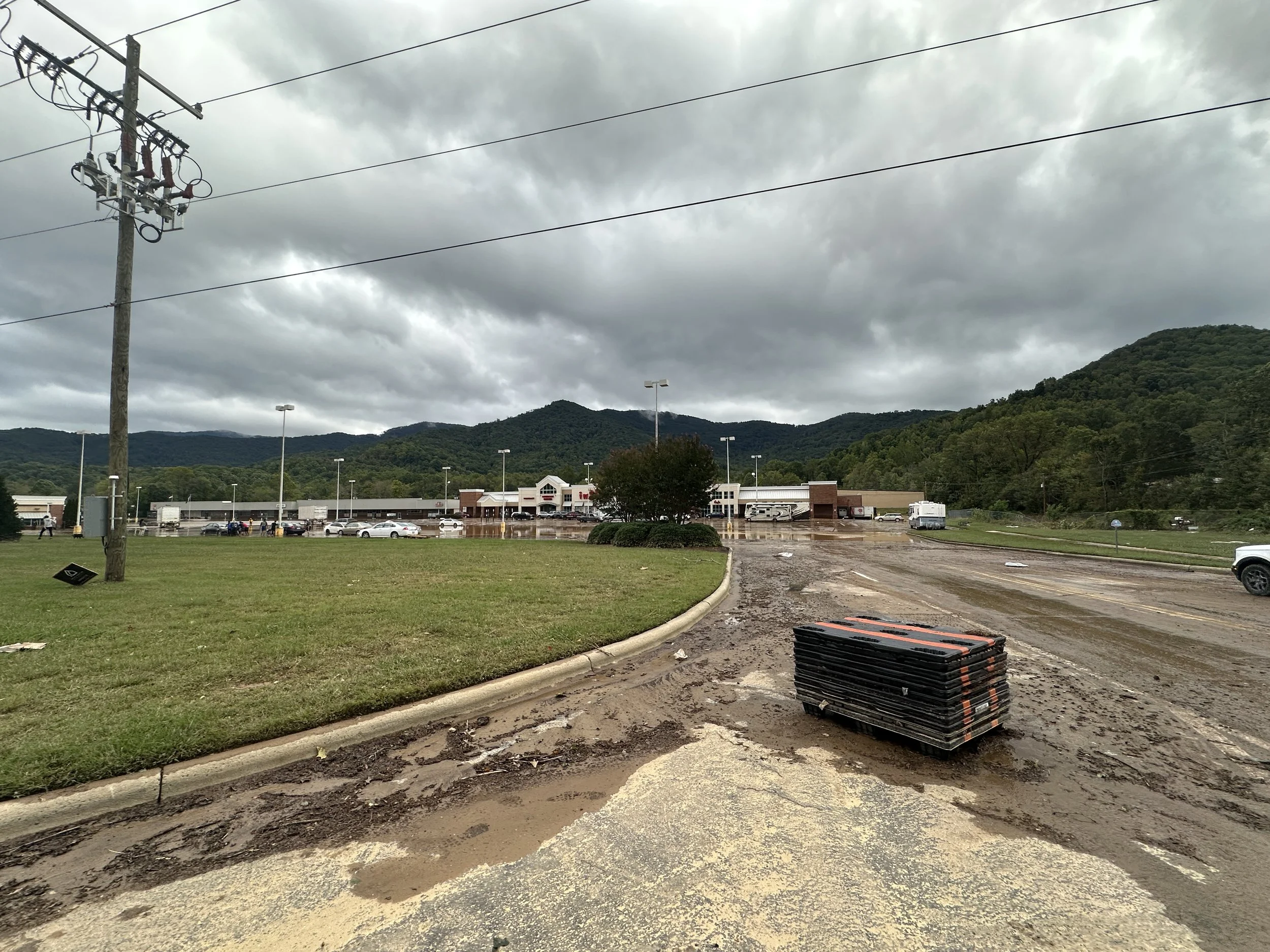 One of the neighbors who had gone out, clearing fallen trees from the street, warned us that the roads were hazardous and some areas impassable. Carefully, we decided to explore. The Ingles grocery parking lot down the street was thick with mud and water, where people were wading through muck trying to salvage their cars. We saw fallen trees and mudslides, then a bridge overtaken by debris from a nearby house swept up by the creek.