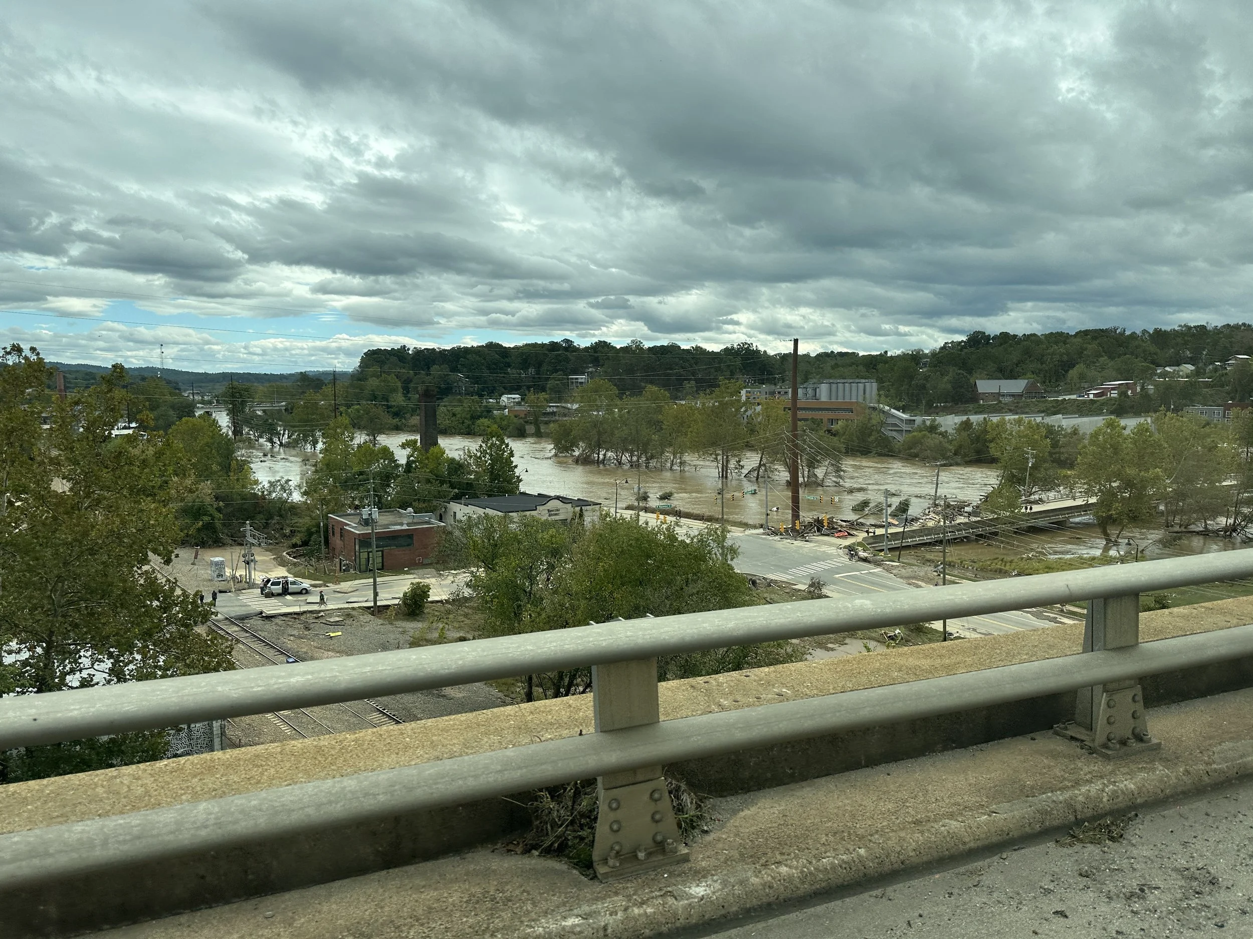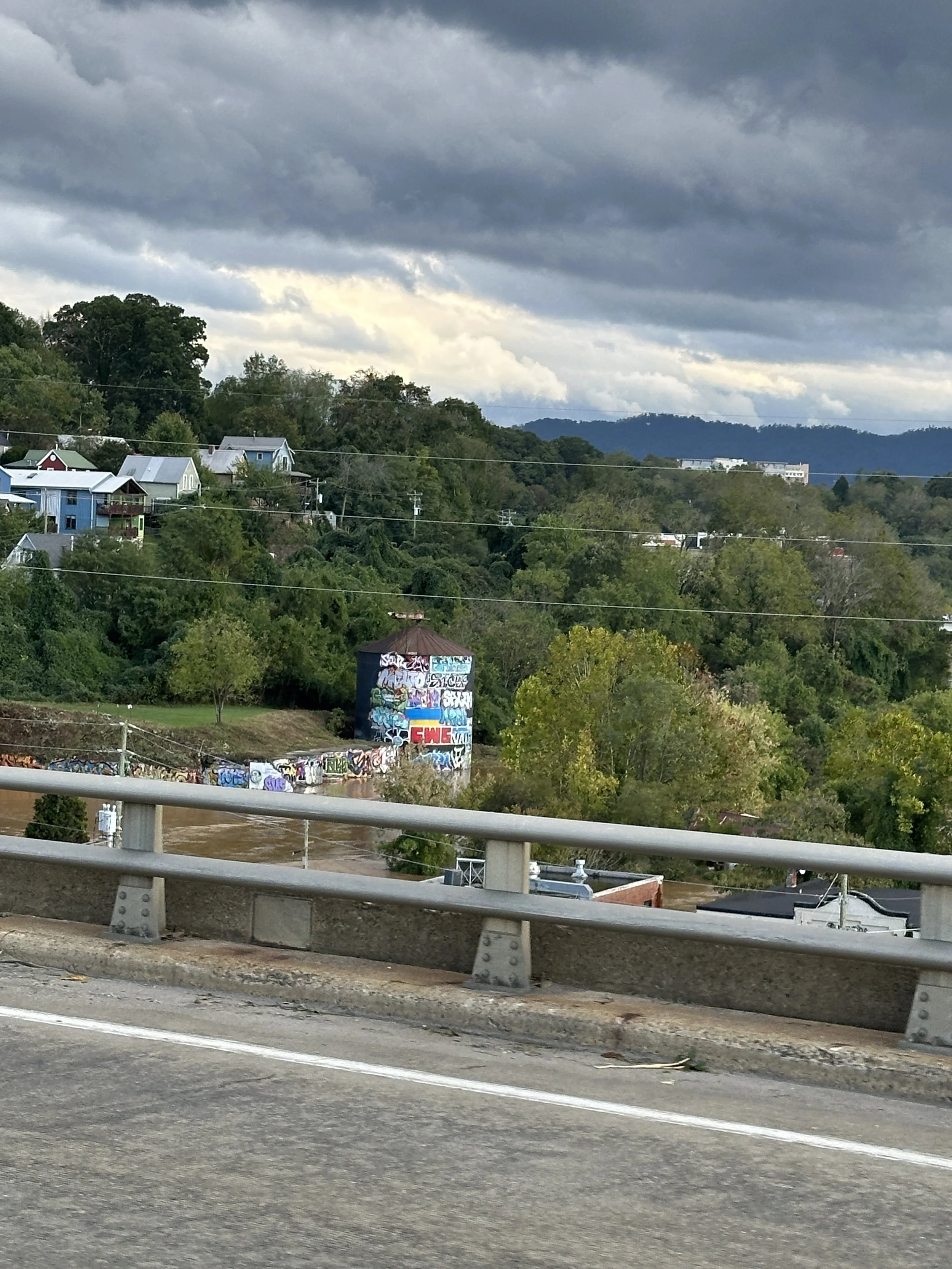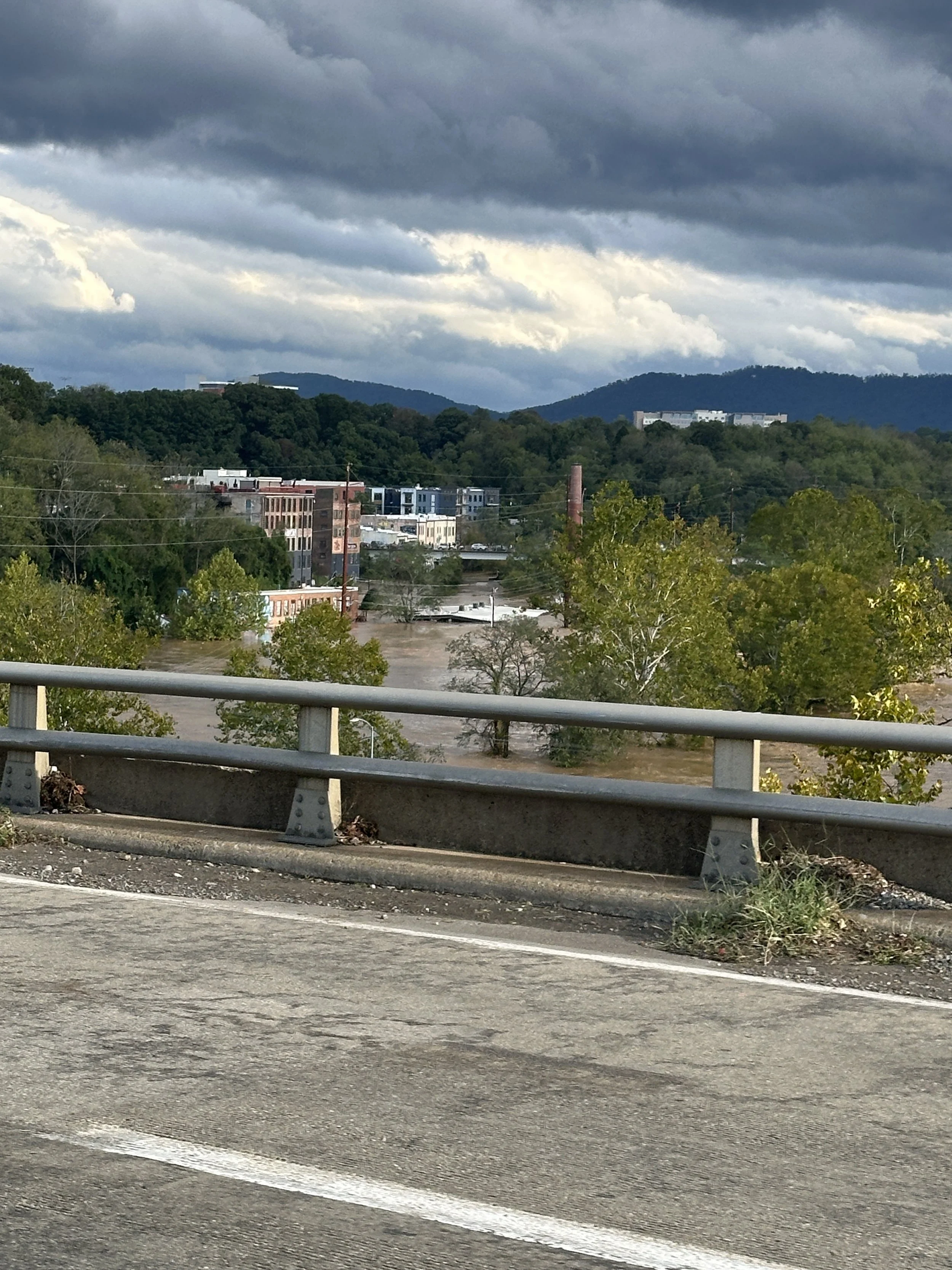 We drove across the 240 highway, hoping to find Sam’s Club open (it would open later in the week to members and non-members). While Crossing the French Broad River the sight we saw was haunting—the River Arts District was submerged by the raging waters, erasing areas we’d casually walked just days before. Deciding to head back we experienced mostly deserted roads except for backed-up traffic near areas of damage.
