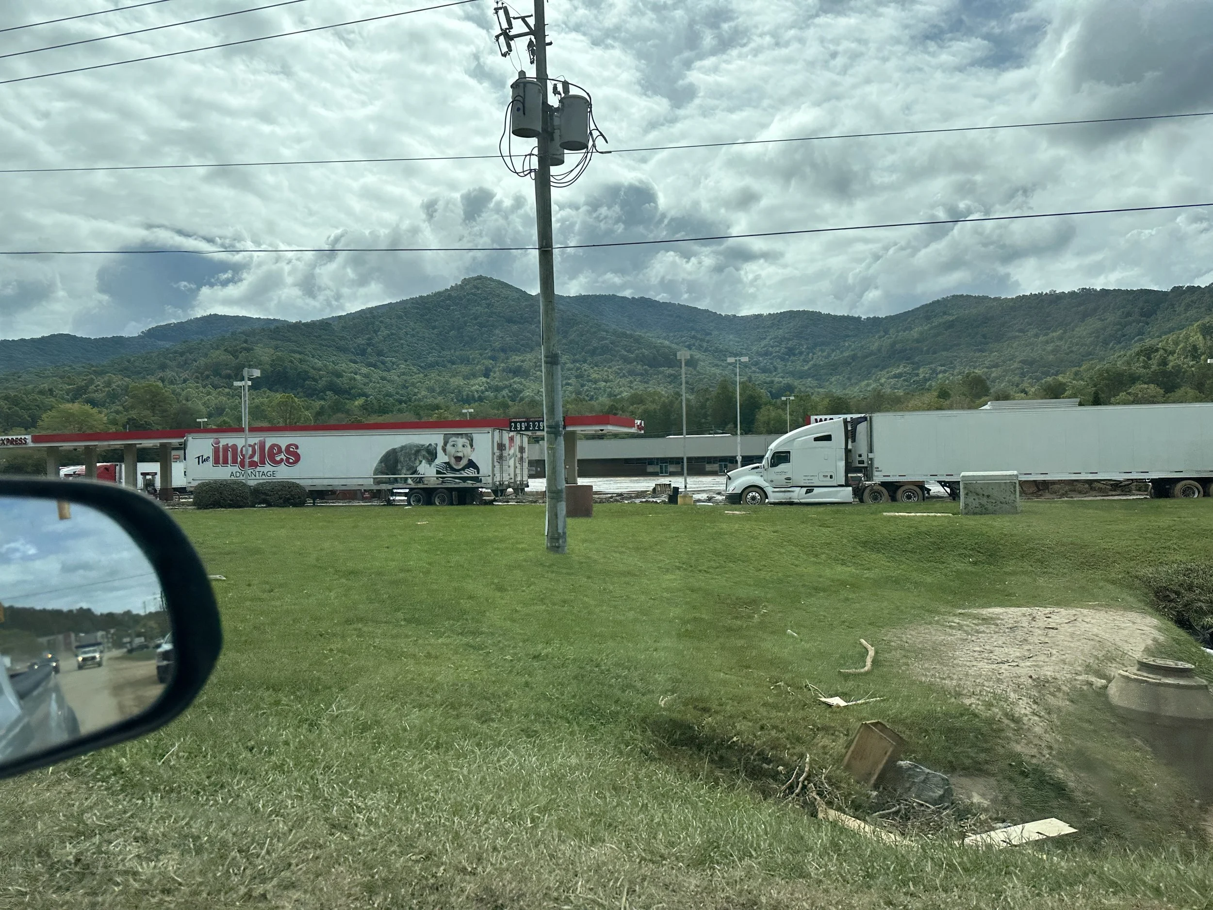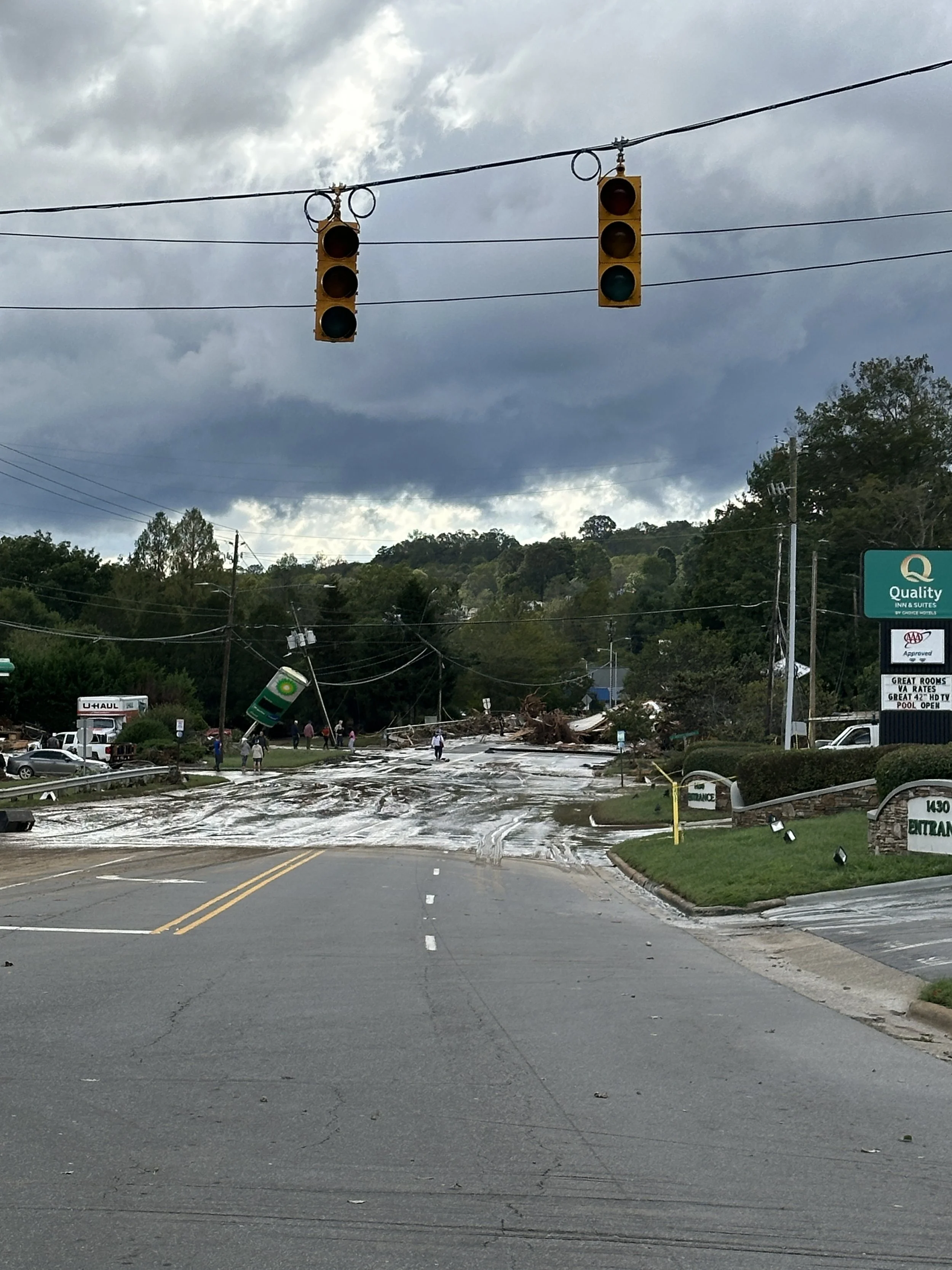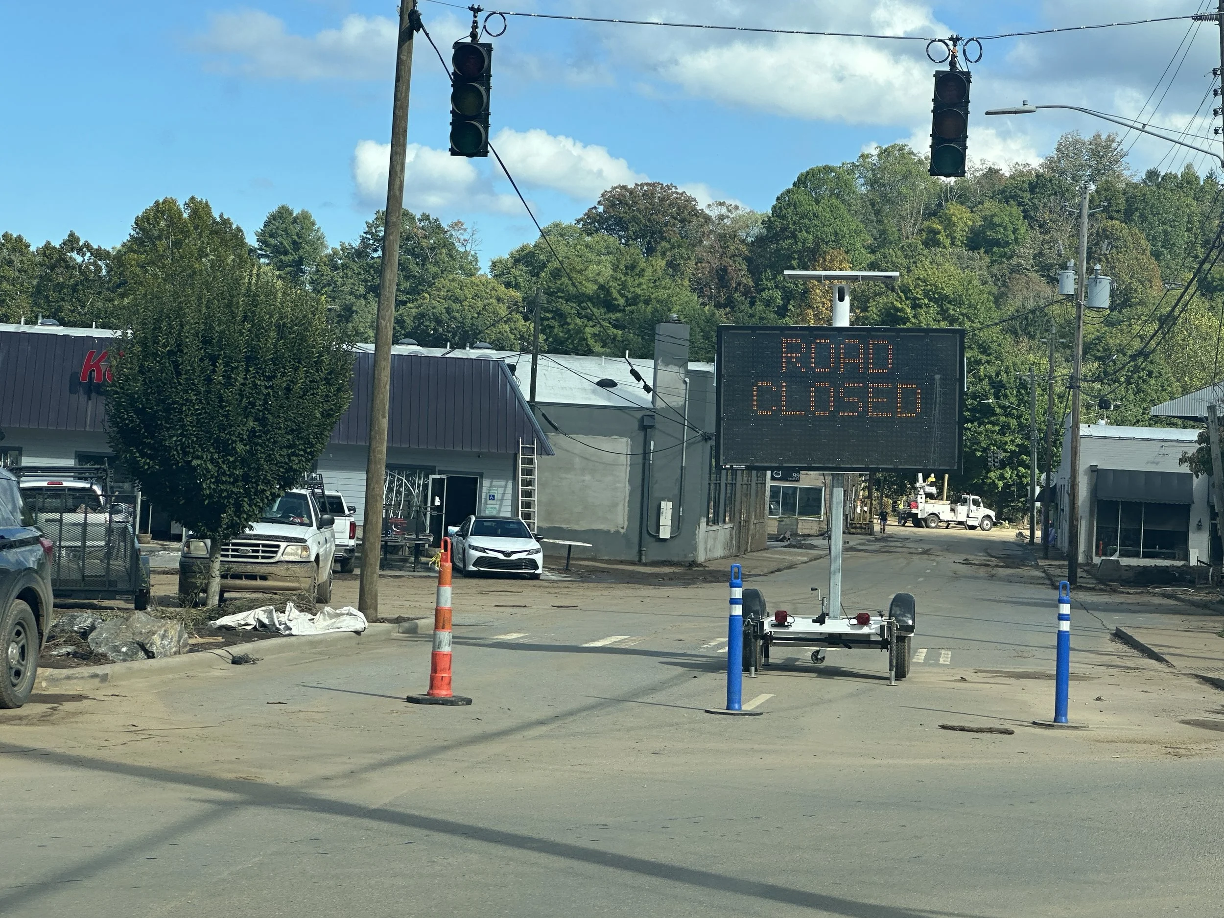 We drove across the 240 highway, hoping to find Sam’s Club open (it would open later in the week to members and non-members). While Crossing the French Broad River the sight we saw was haunting—the River Arts District was submerged by the raging waters, erasing areas we’d casually walked just days before. Deciding to head back we experienced mostly deserted roads except for backed-up traffic near areas of damage.